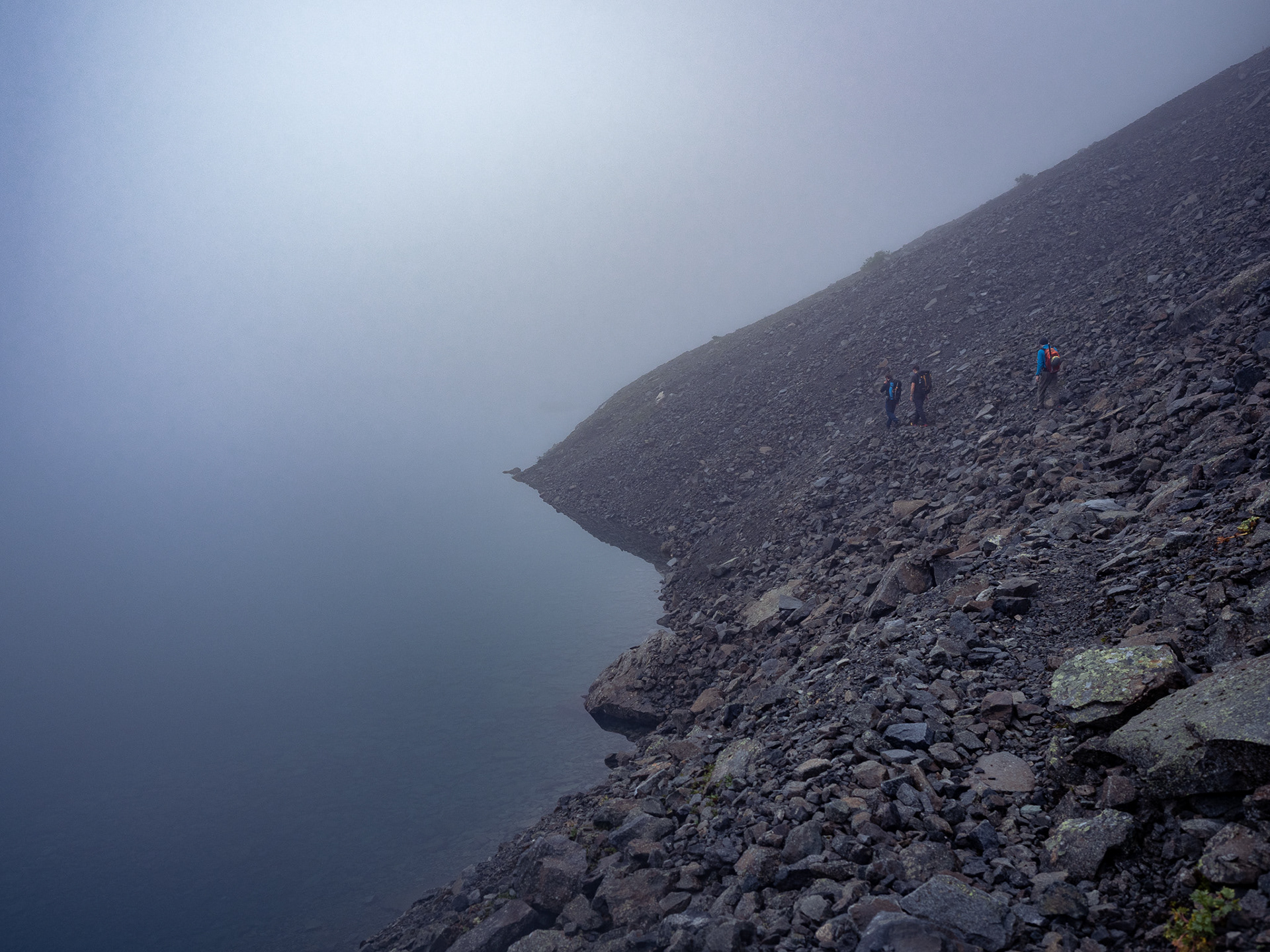 Nun passierte aber genau das, was wir absolut nicht gebrauchen konnten: Es fing an zu regnen. Gut, gehört zum Outdoorsport irgendwie dazu. Ist aber doof, wenn man über steile Felsen und wegloses Gelände absteigen muss. Bei Nässe ist das Ganze nicht so einfach und ungefährlich. Daher dauerte der folgende Abstieg bis zum See im Tal eine geführte Ewigkeit. Bei vielen Stellen musste man sich mehrmals überlegen, wie man sie am geschicktesten überwinden konnte, ohne abzurutschen und schneller im Tal zu sein, als einem lieb war. An einer kleineren Kletterstelle löste sich bei mir ein Stein, an dem ich mich eigentlich festhalten wollte. Ich hatte zum Glück einen sicheren Stand, sodass ich hier zwar nicht ins Rutschen kam, aber dann trotzdem nicht so recht wusste, wie ich diese Stelle am besten abklettern sollte.