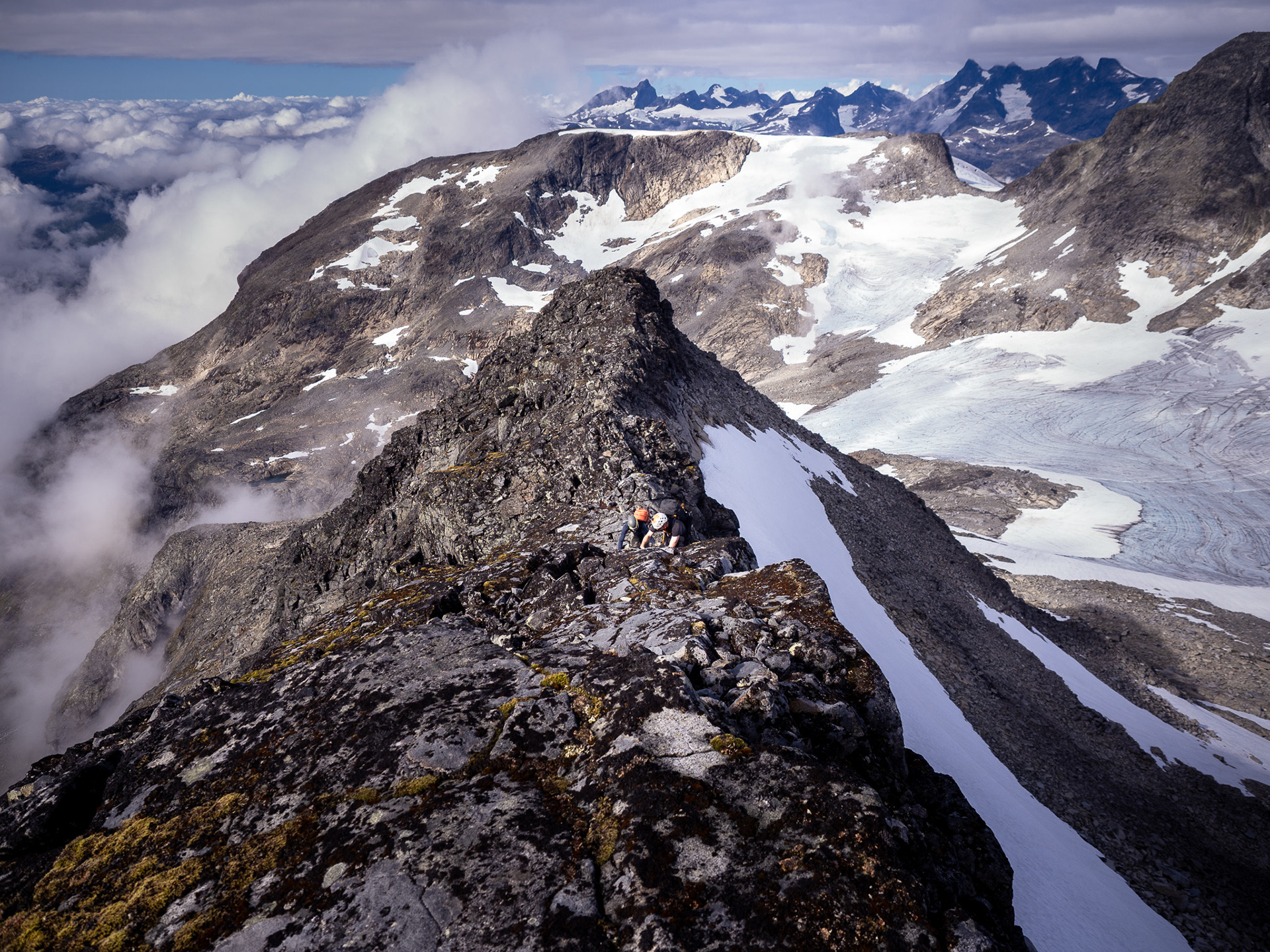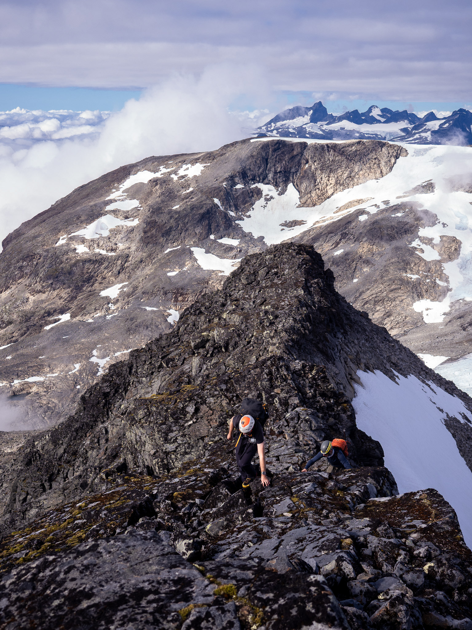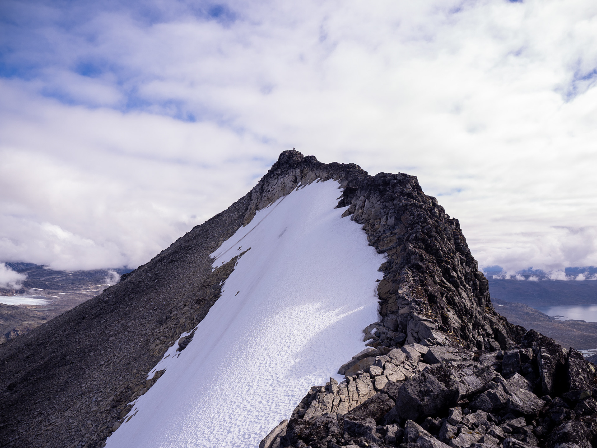 Oben an dem kleineren Plateau angekommen, verzogen sich erstmal die dichten Wolken und man konnte endlich mal die umliegenden Gipfel erkennen. Zugleich bot sich hier auch der erste Blick auf den Gipfel des Falketinds und den Westgrat, über den wir ihn erreichen wollten. Vor dessen Beginn musste noch ein weiteres Schneefeld passiert werden. An dessen Ende ging es dann steil bergauf. Die Felsen in leichter Kletterei aufsteigend, erreicht man schnell den finalen Gipfelgrat. Dieser ist klettertechnisch wiederum nicht schwierig, allerdings ziemlich ausgesetzt. Zur rechten Seite geht es nahezu senkrecht bergab. "Don't fall", war der hilfreiche Tipp eines Kollegen, "and if you fall, fall to the left". Wie immer im hochalpinen, absturzgefährdeten Gelände war also Vorsicht geboten - nicht ganz ungefährlich war hier in erster Linie, dass der Fels auch am Grat stellenweise mit Moos oder Flechten bewachsen und ziemlich rutschig war.