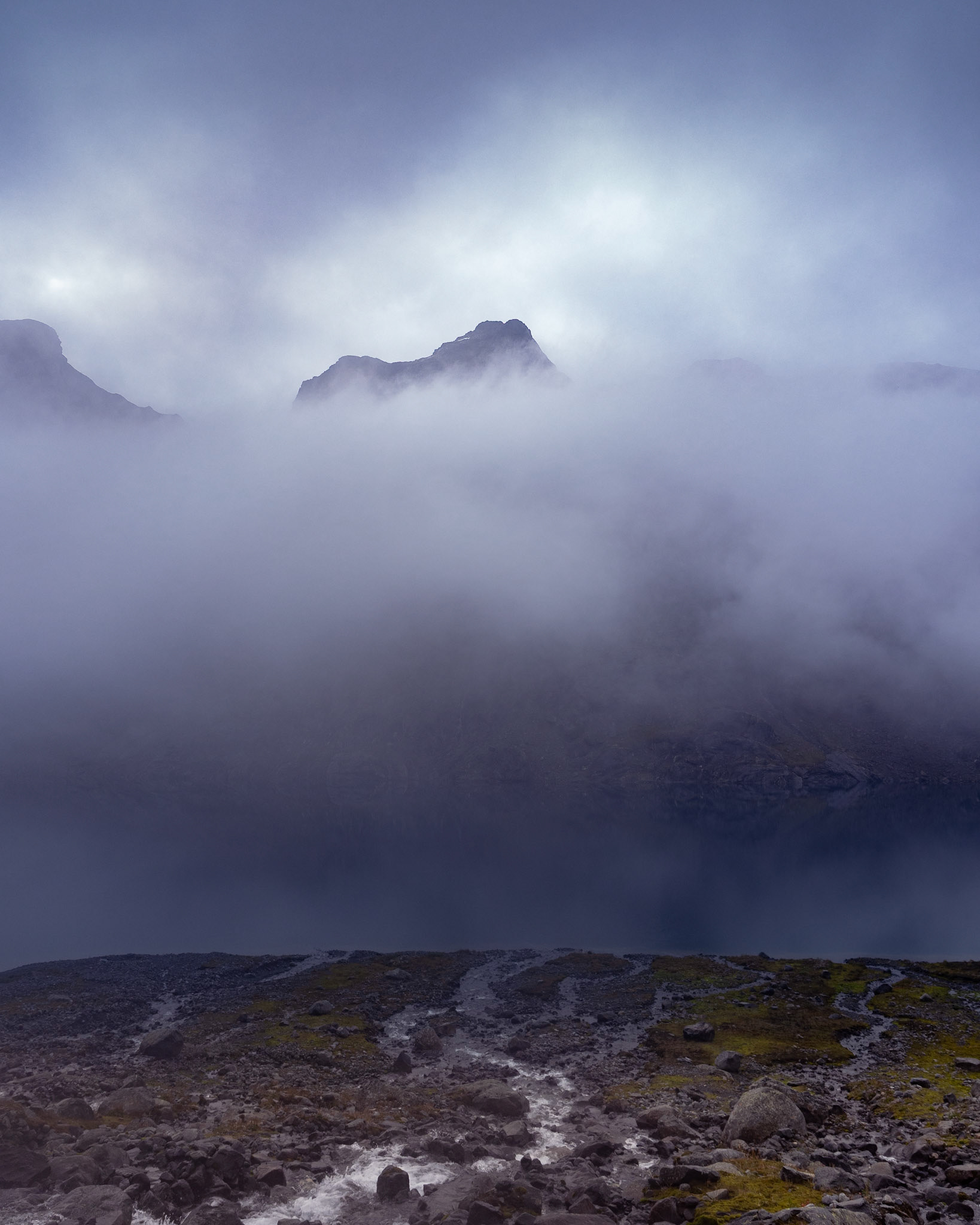 Zwischen dem zweiten See, dessen Namen ich nicht kenne, und dem dritten, dem Andrevatnet, gilt es ein Schneefeld zu passieren. In unserem Fall, spät in der Saison, war dieses schon stark zusammengeschmolzen und war so leicht zu begehen. Zu anderen Zeiten können hier Eispickel und Steigeisen sinnvoll sein. Daran anschließend durften wir ein bisschen bergauf kraxeln um direkt danach wieder durch größere Steinbrocken hindurch zum Andrevatnet abzusteigen. Zunächst in dichtem Nebel am Ufer entlang, ging es kurz darauf tatsächlich mal längerfristig bergauf. Hier gab es wieder einige Bäche zu passieren, die alle aus einem größeren Wasserfall entstehen. Dieser wiederum wird von Schmelzwasser des Stølsnosbreen, einem Gletscher auf der Westseite des Falketind, gespeist. An diesem Wasserfall entlang verläuft nun im Grunde auch der weitere Aufstieg, bis man ein kleineres Plateau mit einigen Schneefeldern erreicht. Allerdings verlieren sich auch hier immer wieder die Pfadspuren und so kann man sich seinen Weg durch das ausgesetzte und rutschige Felsgelände wieder selbst suchen. Dabei gilt es, die ersten kürzeren Kletterstellen (I) zu überwinden.