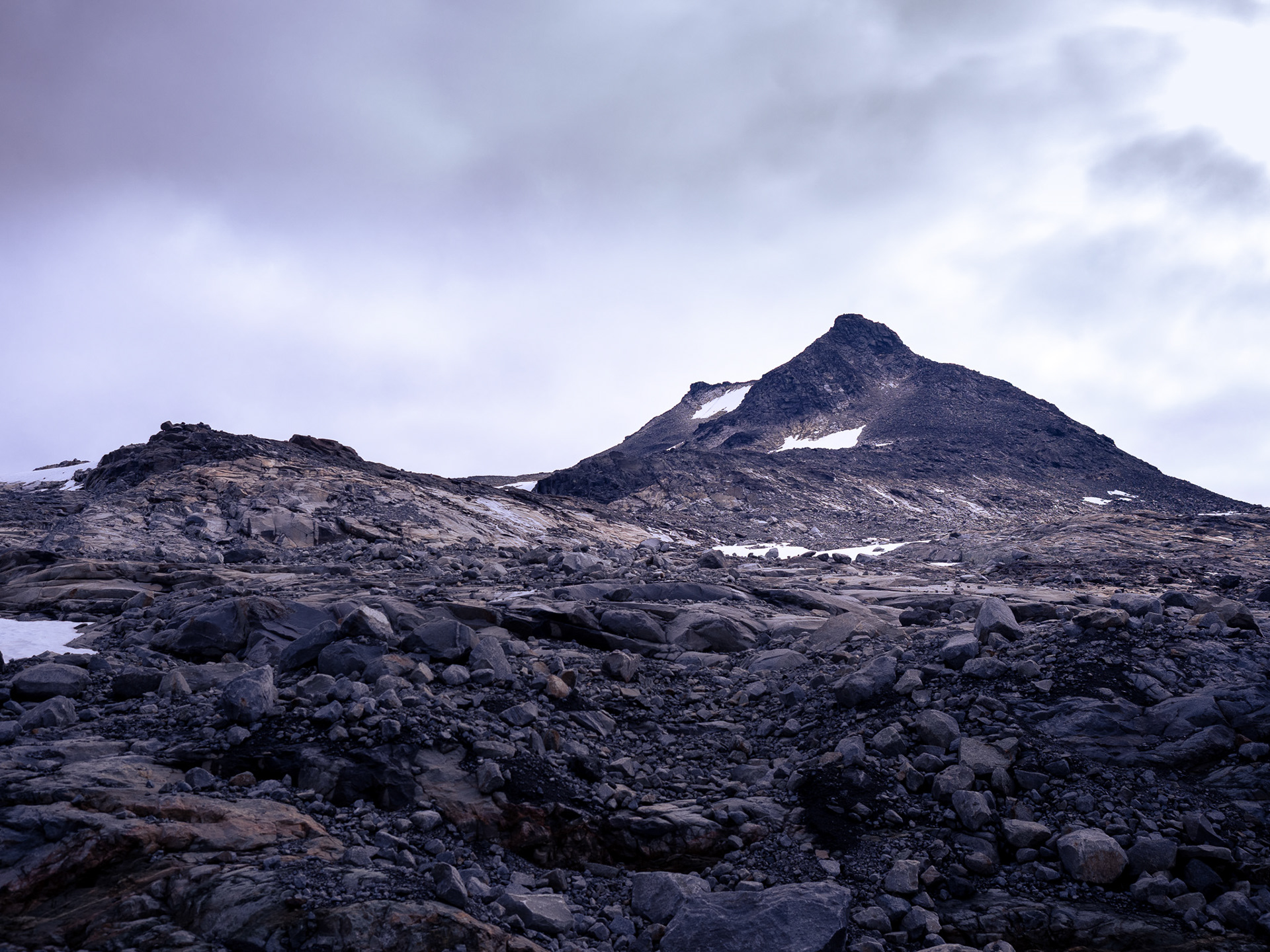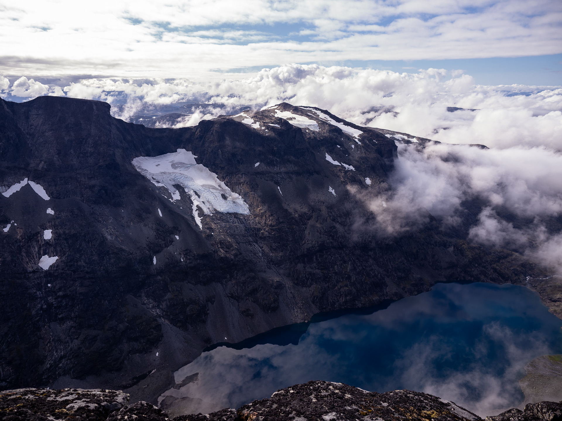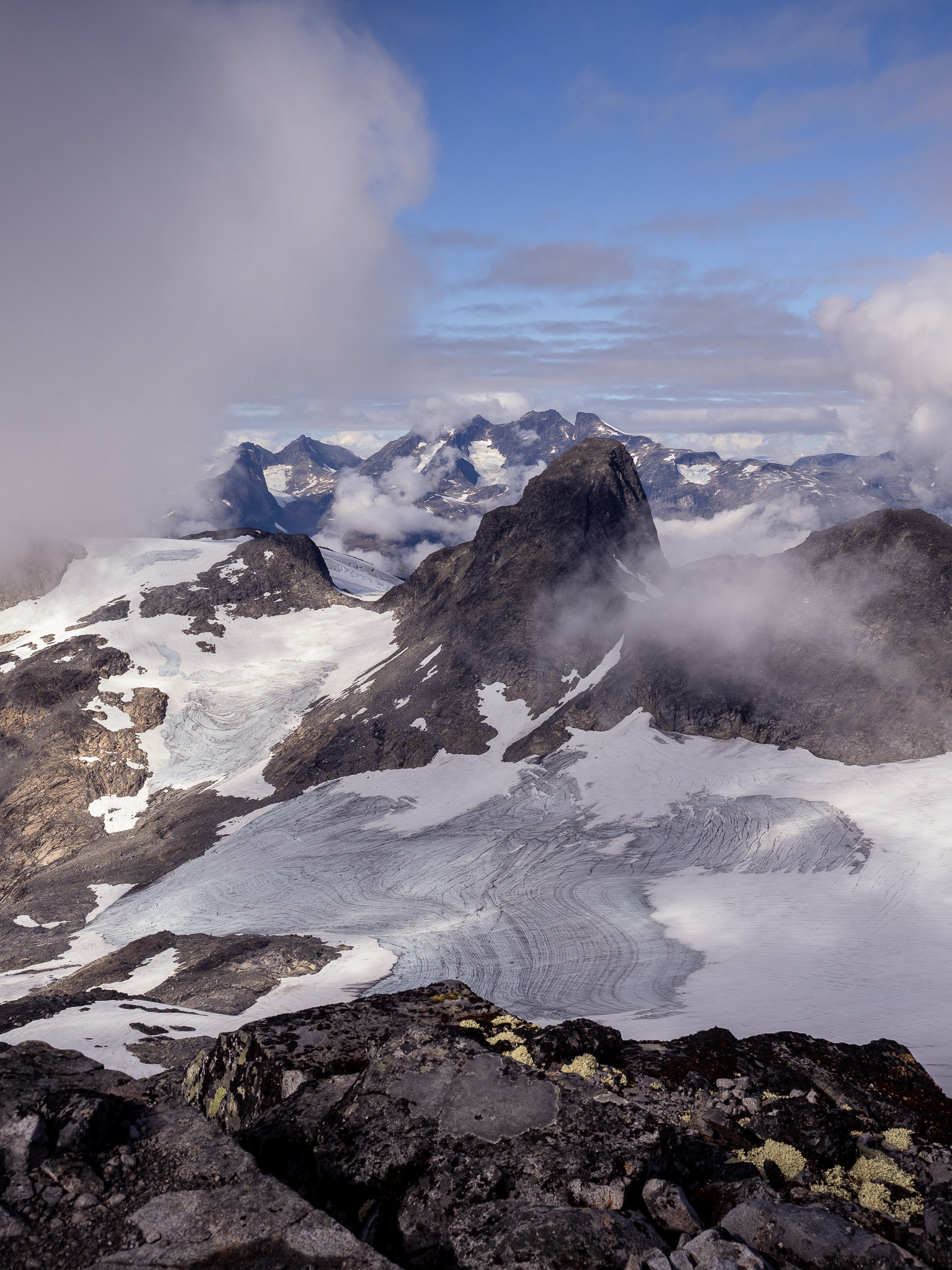 Das Gelände im Jotunheimen-Nationalpark ist, wie anfangs erwähnt, durchaus anspruchsvoll; kaum richtige Wanderwege, wenn doch mal vorhanden, verlieren sie sich schnell wieder in Flechten, Moos oder Blockgelände. Wenn es dann noch ununterbrochen regnet, wird dieser Untergrund besonder schön rutschig, was uns schonmal einen Vorgeschmack auf den nächsten Tag gab. Das Ziel für letzteren, der Falketind, schaute zwischendurch mal durch die Wolken hindurch, hielt sich sonst aber eher bedeckt. Dafür konnte man zumindest von einem ca. 1.500 Meter hohen Hügel die Aussicht auf den Falkebreen, einen eher kleineren Gletscher, oder zumindest dessen Zunge mit wirklich schönem, hellblauen Eis genießen.